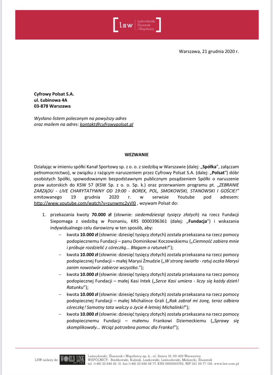 Polsat bez żadnych przyczyn zablokowaÅ stream charytatywny który odbywaÅ siÄ na kanale. Ponadto Kanał Sportowy żąda przeprosin o następującej treści która także została udostępniona podczas transmisji programu Dziennikarskie Zero. Zachęcamy do udziału w licytacjach charytatywnychWylicytuj korki Roberta Lewandowskiego i pomóż 2-letniemu Frankowihttpswwwsiepomagaplpomagamy-fran.
